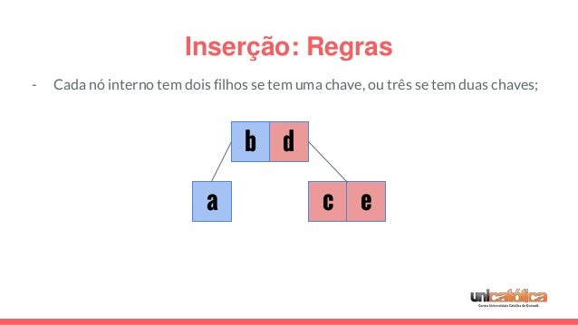 - 14. Inserção: Nó com 2 chaves ca b Nºs > que BNºs < que B Nós com 1 chave devem sempre ter 2 filhos