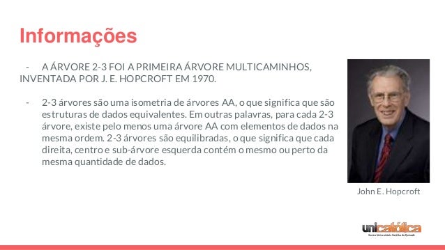 - 2. Informações - A ÁRVORE 2-3 FOI A PRIMEIRA ÁRVORE MULTICAMINHOS, INVENTADA POR J. E. HOPCROFT EM 1970. - 2-3 árvores são uma isometria de árvores AA, o que significa que são estruturas de dados equivalentes. Em outras palavras, para cada 2-3 árvore, existe pelo menos uma árvore AA com elementos de dados na mesma ordem. 2-3 árvores são equilibradas, o que significa que cada direita, centro e sub-árvore esquerda contém o mesmo ou perto da mesma quantidade de dados. John E. Hopcroft