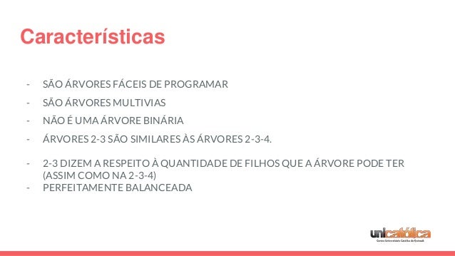 - 3. Características - SÃO ÁRVORES FÁCEIS DE PROGRAMAR - SÃO ÁRVORES MULTIVIAS - NÃO É UMA ÁRVORE BINÁRIA - ÁRVORES 2-3 SÃO SIMILARES ÀS ÁRVORES 2-3-4. - 2-3 DIZEM A RESPEITO À QUANTIDADE DE FILHOS QUE A ÁRVORE PODE TER (ASSIM COMO NA 2-3-4) - PERFEITAMENTE BALANCEADA