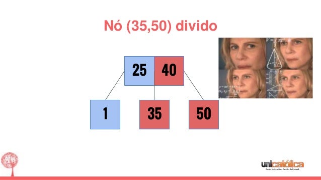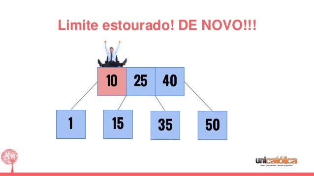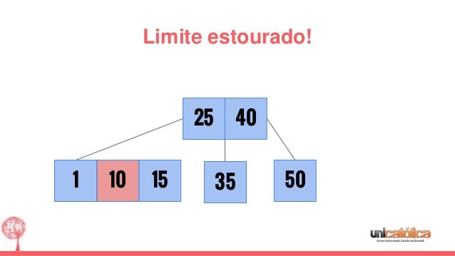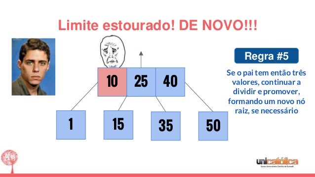 - 39. 25 40 Limite estourado! DE NOVO!!! 10 Se o pai tem então três valores, continuar a dividir e promover, formando um novo nó raiz, se necessário Regra #5 1 35 5015