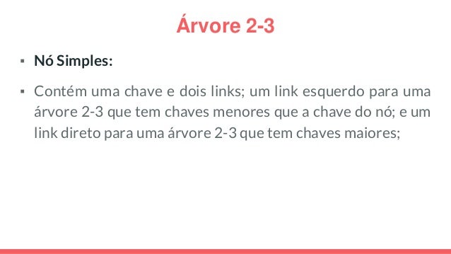 - 45. Árvore 2-3 ▪ Nó Simples: ▪ Contém uma chave e dois links; um link esquerdo para uma árvore 2-3 que tem chaves menores que a chave do nó; e um link direto para uma árvore 2-3 que tem chaves maiores;