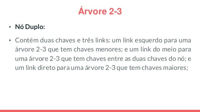 - 46. Árvore 2-3 ▪ Nó Duplo: ▪ Contém duas chaves e três links: um link esquerdo para uma árvore 2-3 que tem chaves menores; e um link do meio para uma árvore 2-3 que tem chaves entre as duas chaves do nó; e um link direto para uma árvore 2-3 que tem chaves maiores;