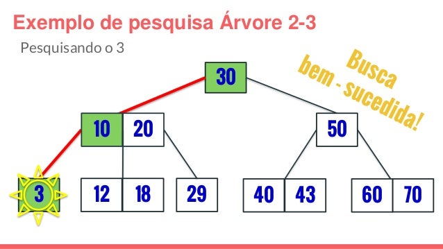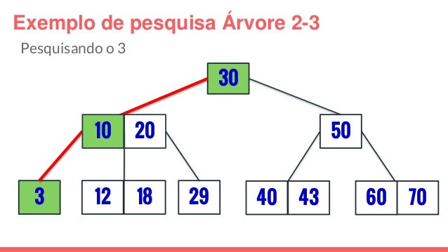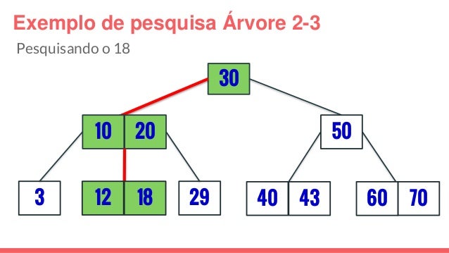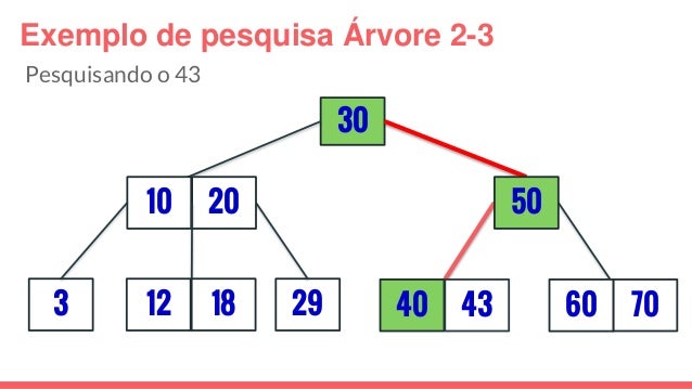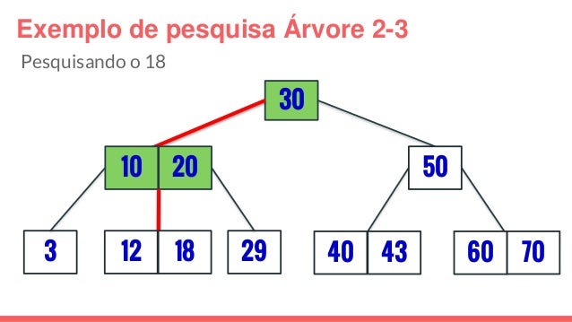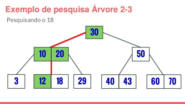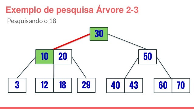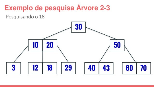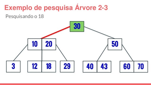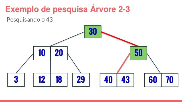 - 50. Exemplo de pesquisa Árvore 2-3 3 30 29 5010 20 12 18 40 43 7060 Pesquisando o 18