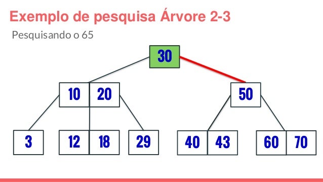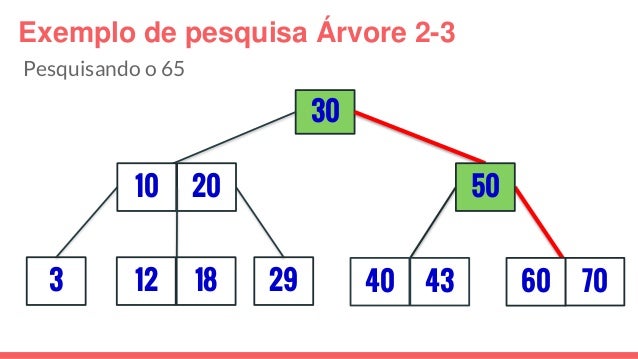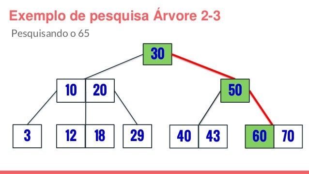 - 64. Exemplo de pesquisa Árvore 2-3 3 30 29 5010 20 12 18 40 43 7060 Pesquisando o 65