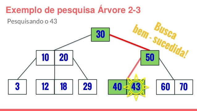 - 70. Exemplo de pesquisa Árvore 2-3 3 30 29 5010 20 12 18 40 43 7060 Pesquisando o 43