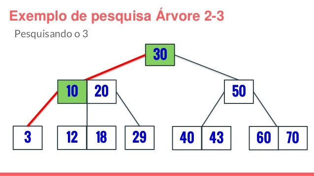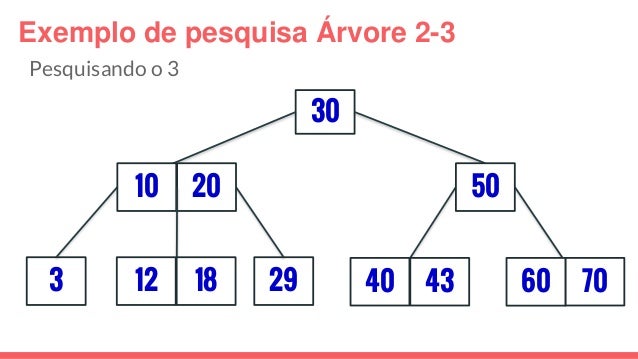 - 76. Exemplo de pesquisa Árvore 2-3 3 30 29 5010 20 12 18 40 43 7060 Pesquisando o 3
