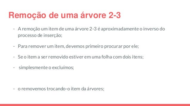 - 81. Remoção de uma árvore 2-3 - A remoção um item de uma árvore 2-3 é aproximadamente o inverso do processo de inserção; - Para remover um item, devemos primeiro procurar por ele; - Se o item a ser removido estiver em uma folha com dois itens; - simplesmente o excluímos; - o removemos trocando-o item da árvores;